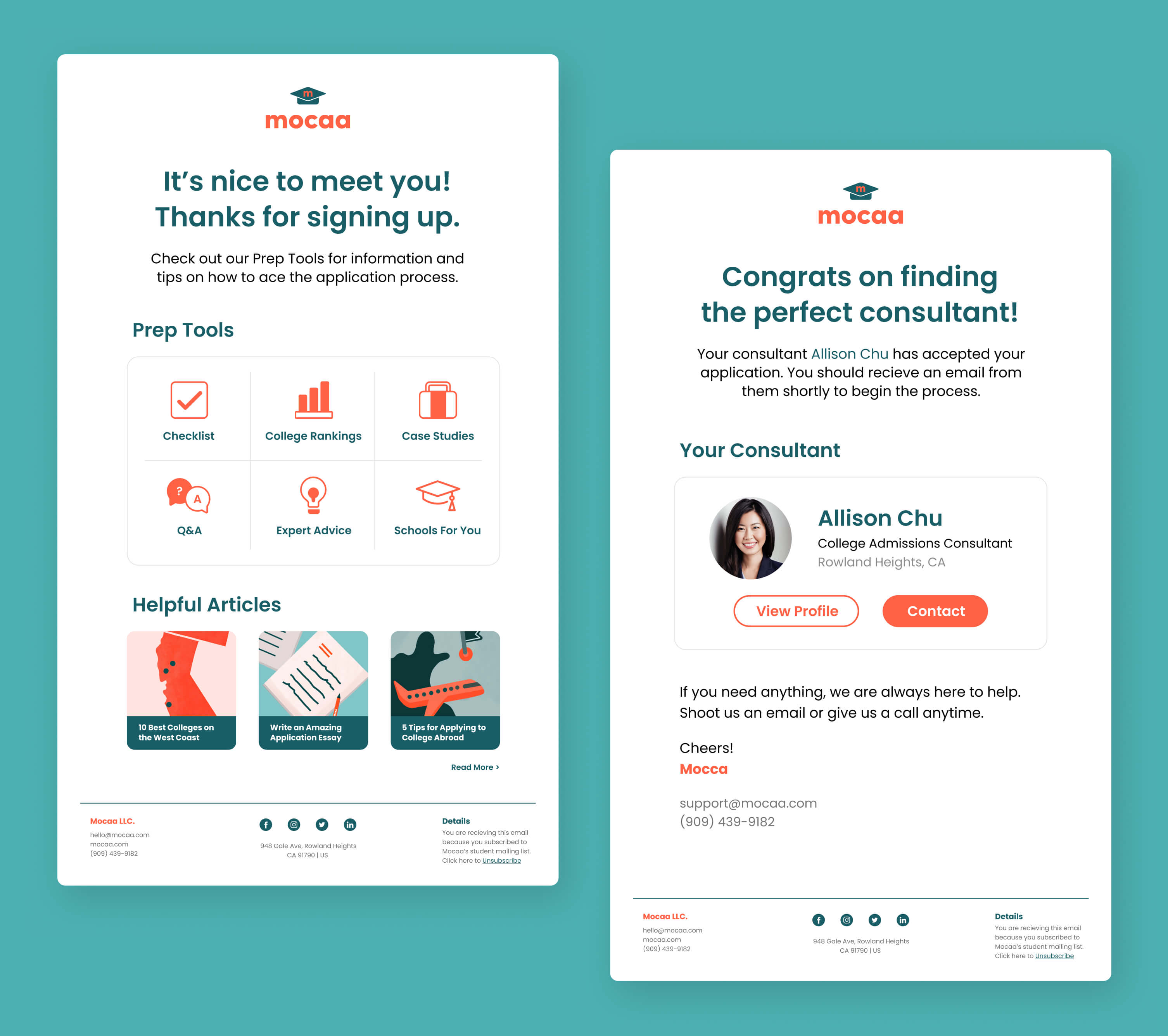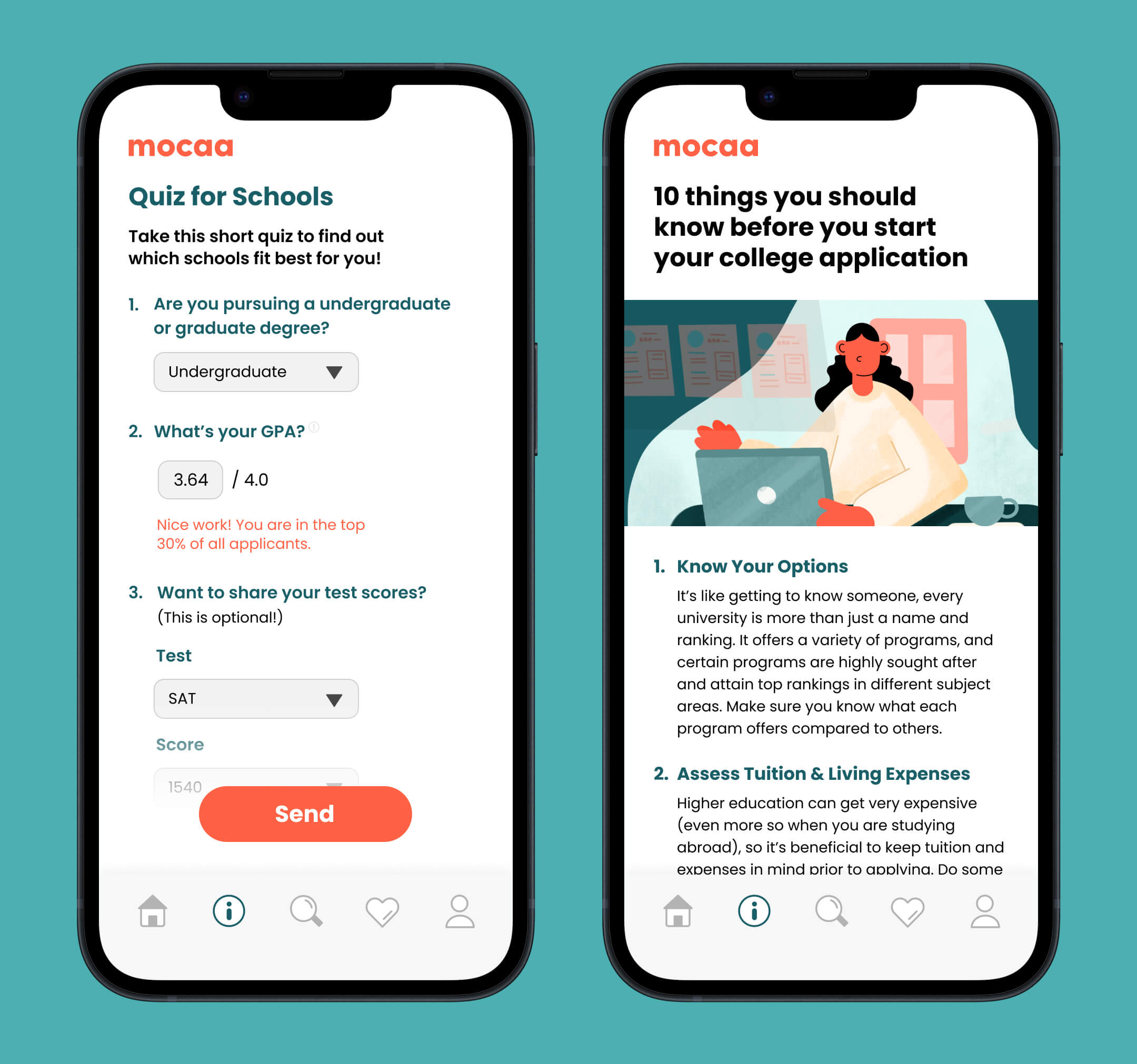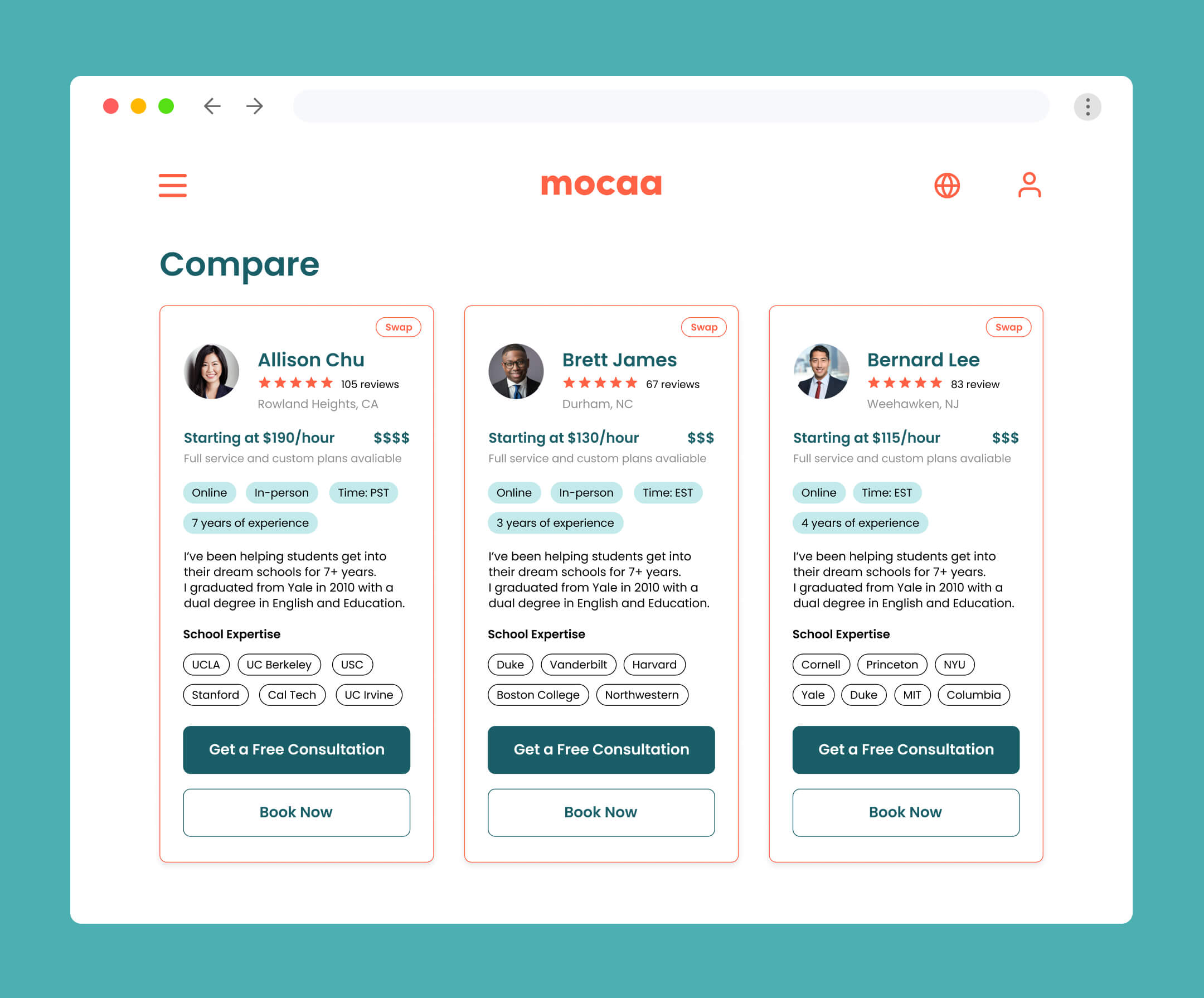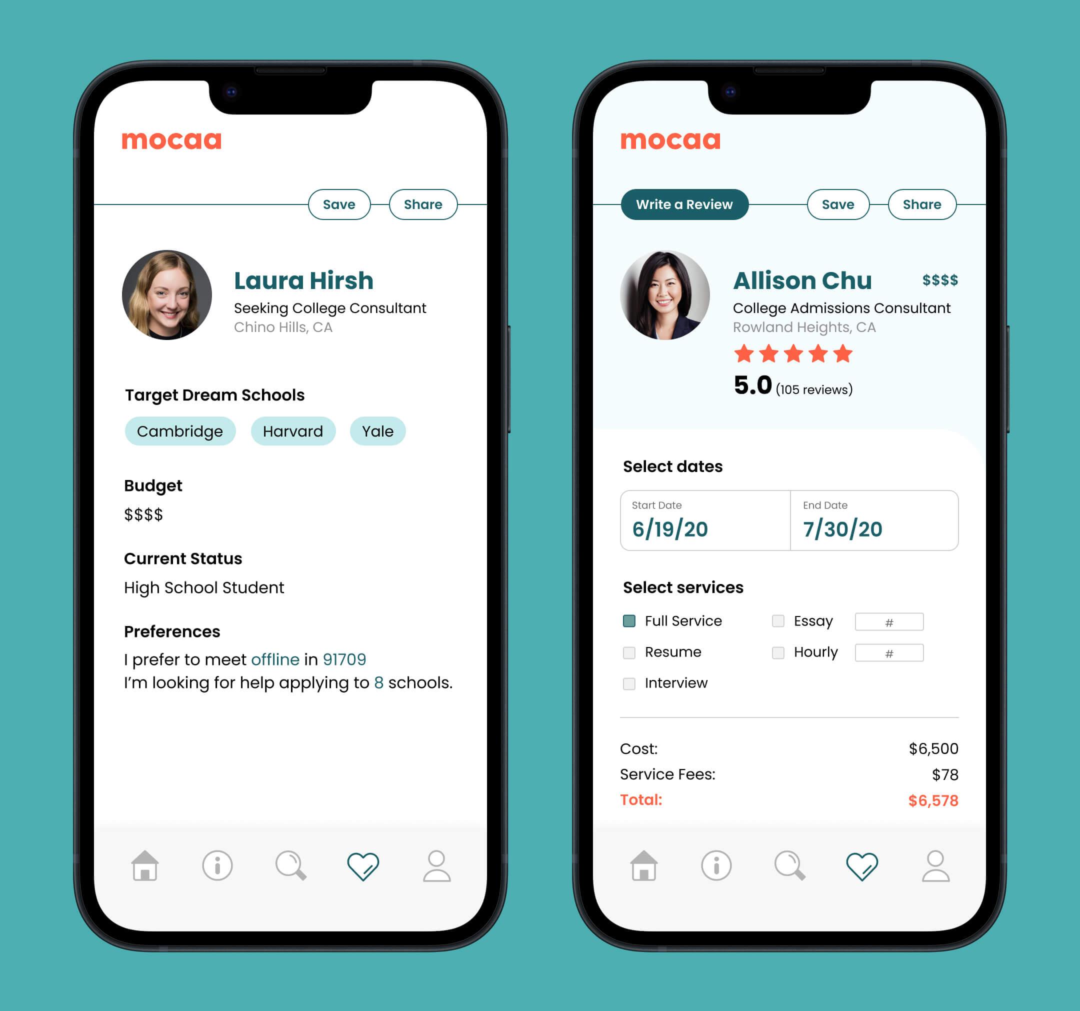 Mocaa is an online platform revolutionizing the university application experience. As the first two-way search platform of its kind, Mocaa connects college applicants with admissions consultants, helping students get into their dream schools and consultants find the clients they're best suited to serve.