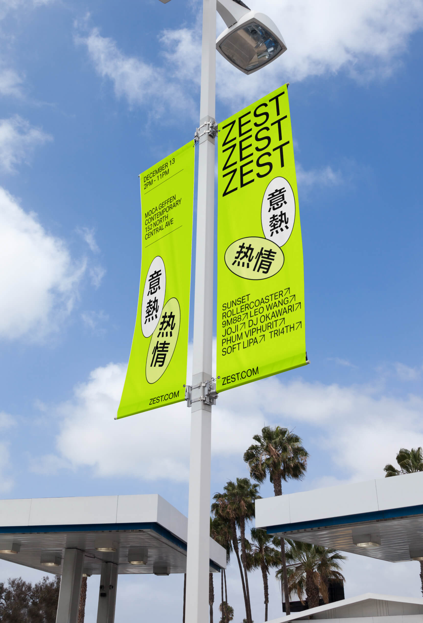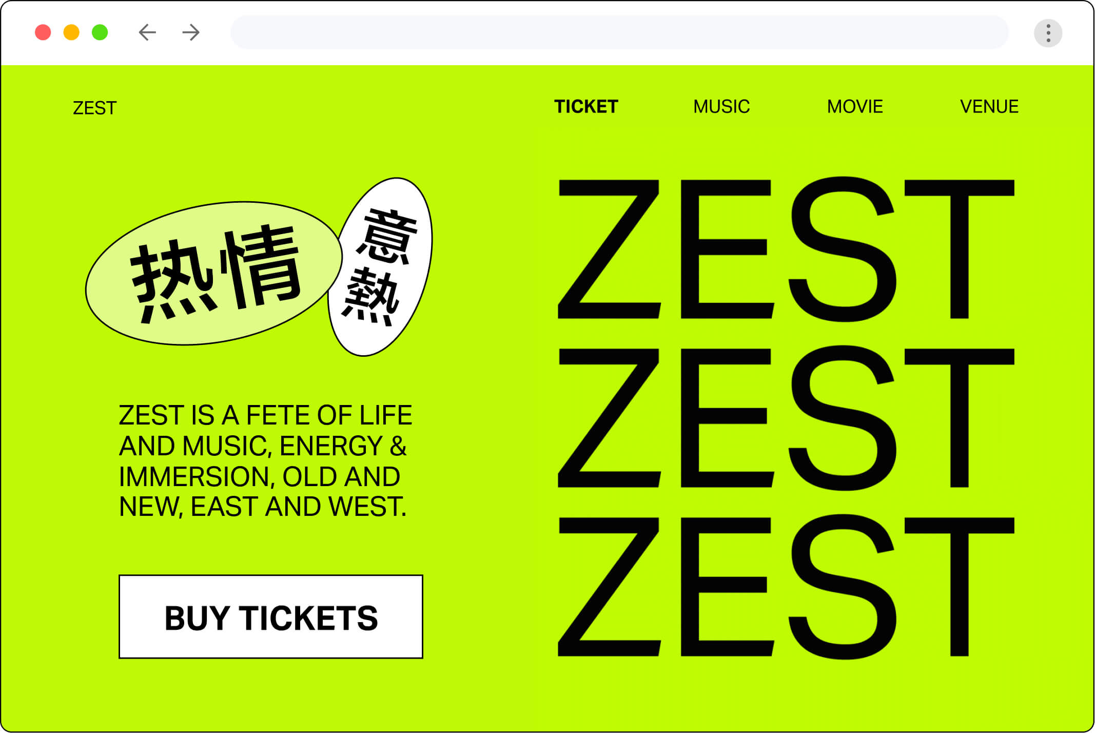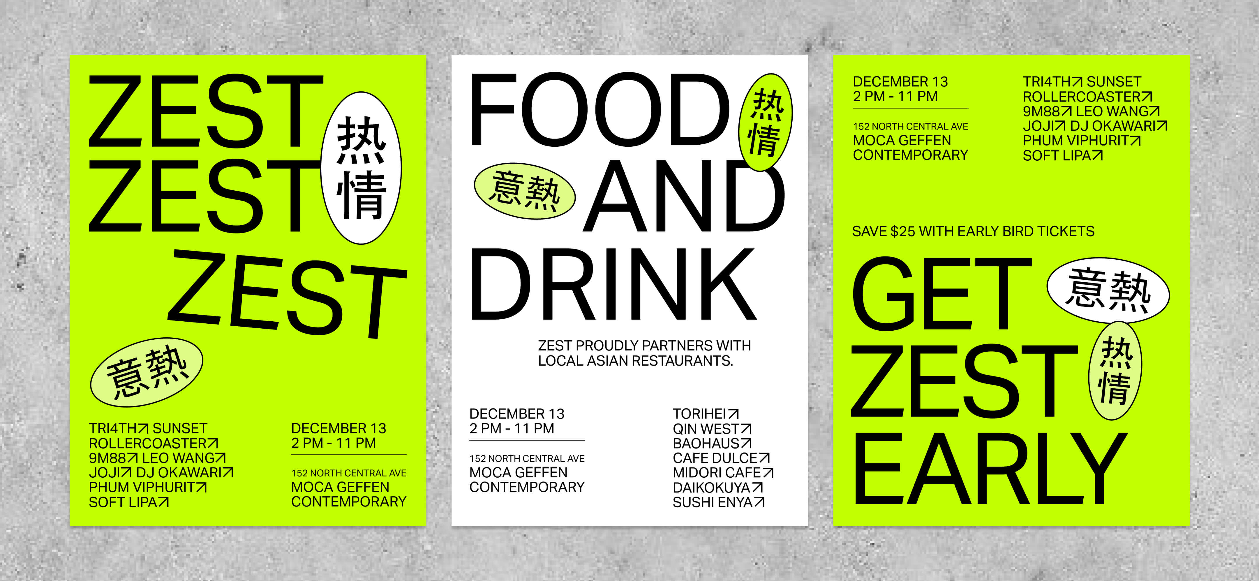Zest is a celebration of life and music, energy and immersion, East and West. This is a concept for a one day festival showcases Asian jazz artists at the MOCA Geffen Contemporary in Los Angeles. Zest was designed in three parts: the identity, the website for tickets sales, and the application for the day of the festival.