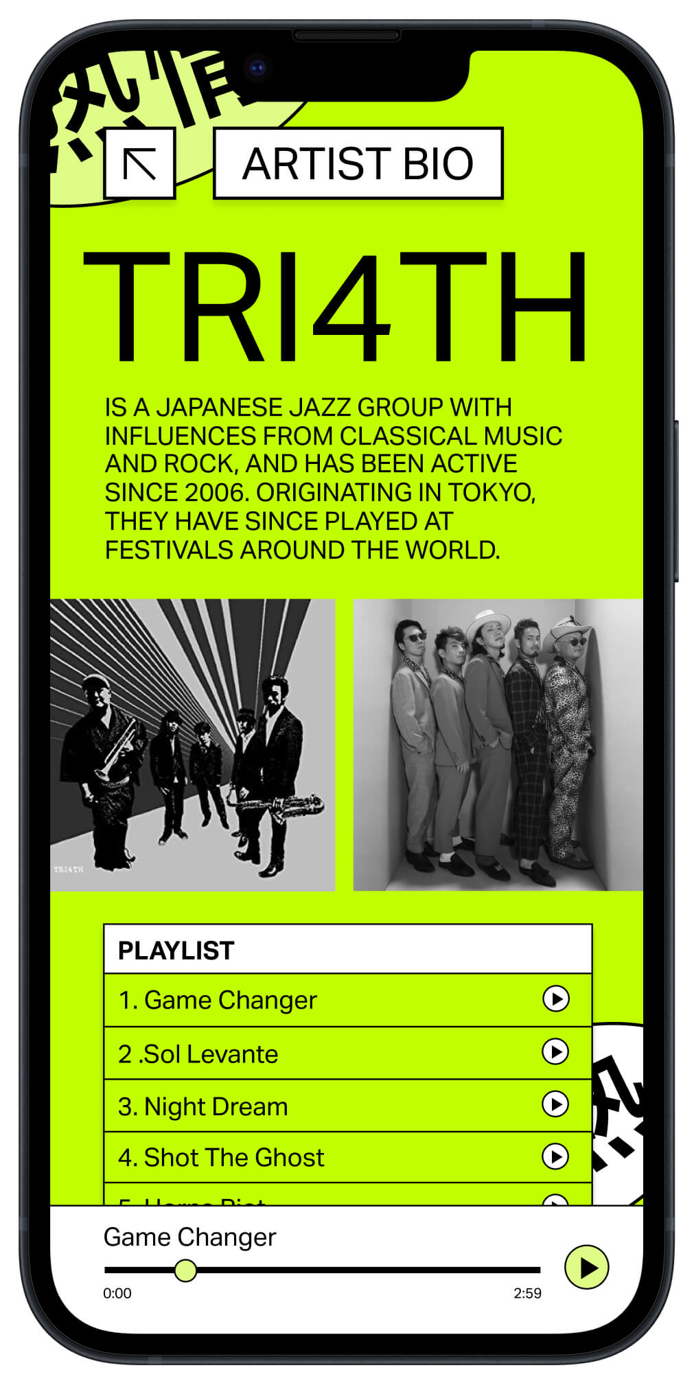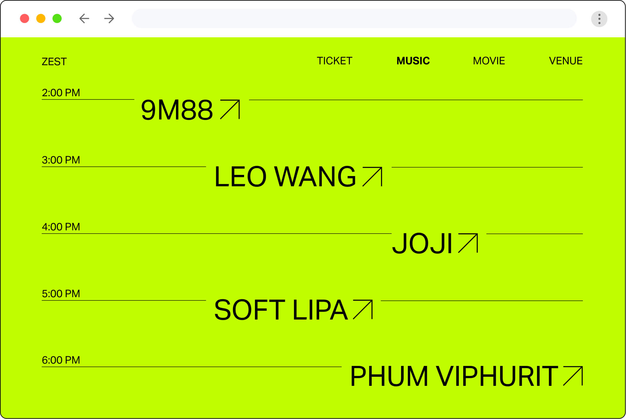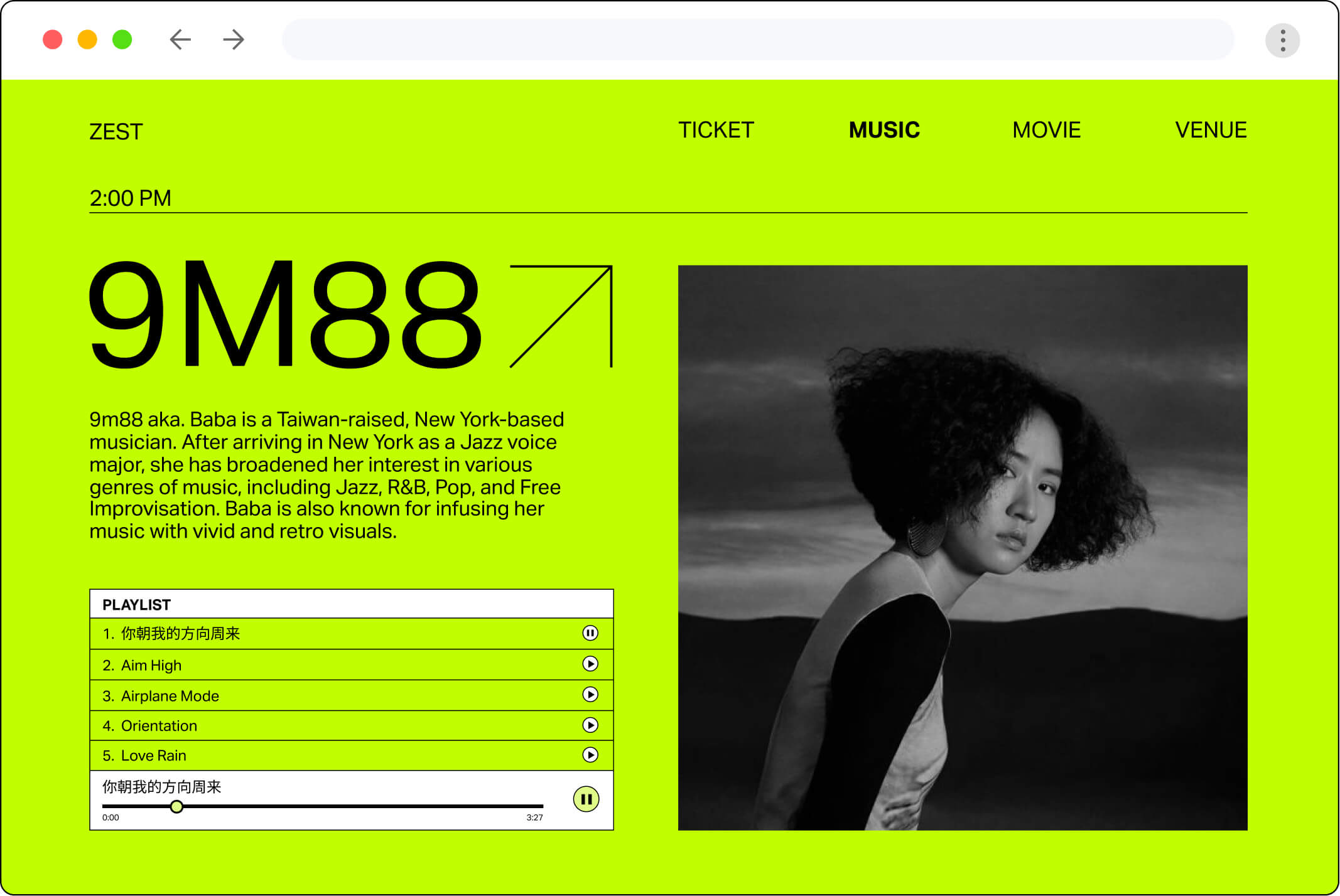 Zest is a celebration of life and music, energy and immersion, East and West. This is a concept for a one day festival showcases Asian jazz artists at the MOCA Geffen Contemporary in Los Angeles. Zest was designed in three parts: the identity, the website for tickets sales, and the application for the day of the festival.